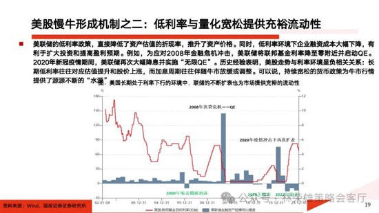 在2008年全球金融危机之后,由低利率与量化宽松提供充裕流动性,使得2010年之后美股慢牛由流动性驱动增强,2020年疫情后,美联储量化宽松政策推动标普500PE从20倍升至24倍以上。
