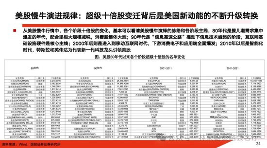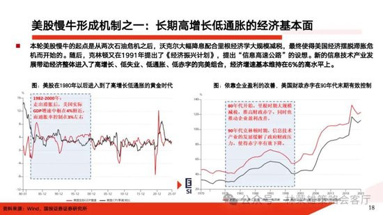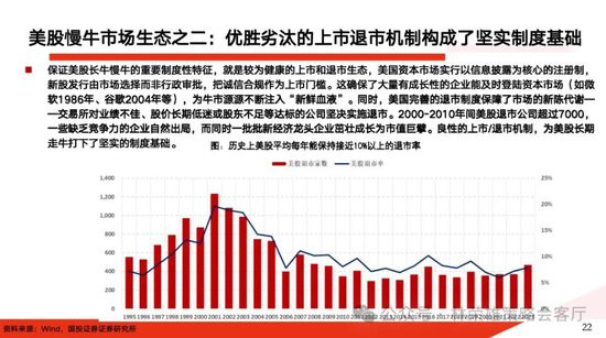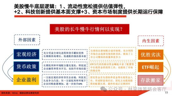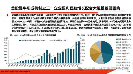 1)、美股慢牛宏观底层逻辑:在长期相对高增长低通胀的经济基本面下,慢牛本质是1、流动性宽松提供估值弹性+2、龙头企业提供基本面支撑配合大规模股票回购+3、资本市场制度提供长期运行保障。同时,对应着良性的股市生态: