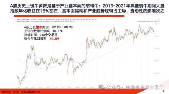 1)、A股历史上慢牛多数是基于产业基本面的结构牛:2019-2021年典型慢牛期间大盘指数年化收益在15%左右,基本面驱动和产业趋势逻辑占主导,流动性的影响次之。