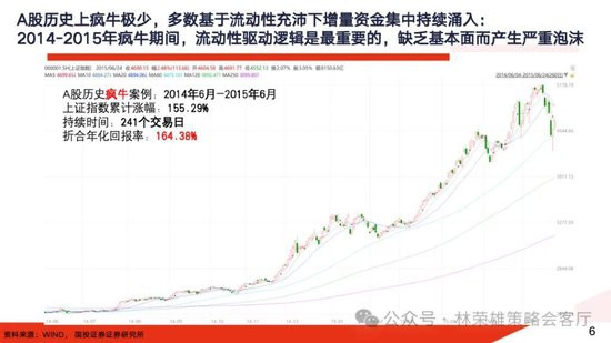 3)、A股历史上疯牛极少,多数基于流动性充沛下增量资金集中持续涌入:2014-2015年疯牛期间,流动性驱动逻辑是最重要的,缺乏基本面而产生严重泡沫
