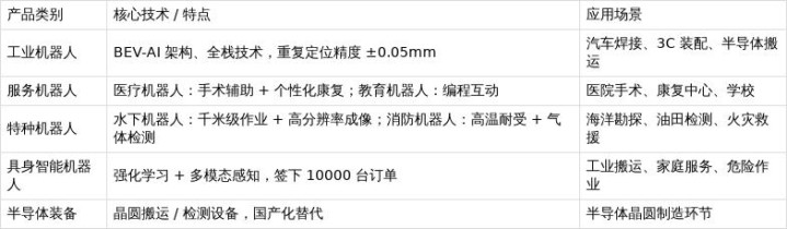 形成 “核心零部件 — 机器人本体 — 系统解决方案” 全产业链布局,覆盖三大品类: