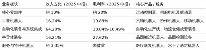 分季度看,2025 年第二季度营收 9.72 亿元(同比 + 4.73%),但归母净利润 - 4509.18 万元(同比 - 110.49%),盈利能力持续恶化。与埃斯顿、拓斯达等国内同行相比,公司仍处于亏损状态,主因高毛利业务占比低,系统集成等低毛利业务占比超 60%。